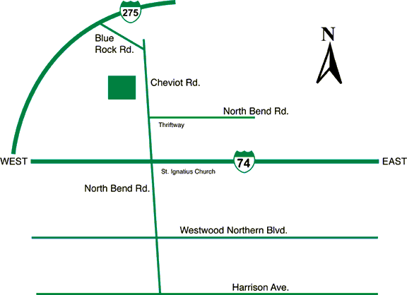 From Harrison and Southeastern Indiana: Travel east on Interstate 74, exit at North Bend Road (Exit 14, from the exit ramp turn left on North Bend Road, proceed for about 1/2 mile on North Bend Road. At the intersection of Cheviot and North Bend Roads, veer left onto Cheviot Road. Our building is immediately on your left.